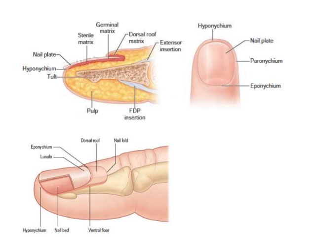 Injuries to the nail are often associated with damage to other structures that are in the same location. These include fractures of the bone (distal phalanx), and/or cuts of the nailbed, fingertip skin (pulp), tendons that straighten or bend the fingertip, and nerve endings.